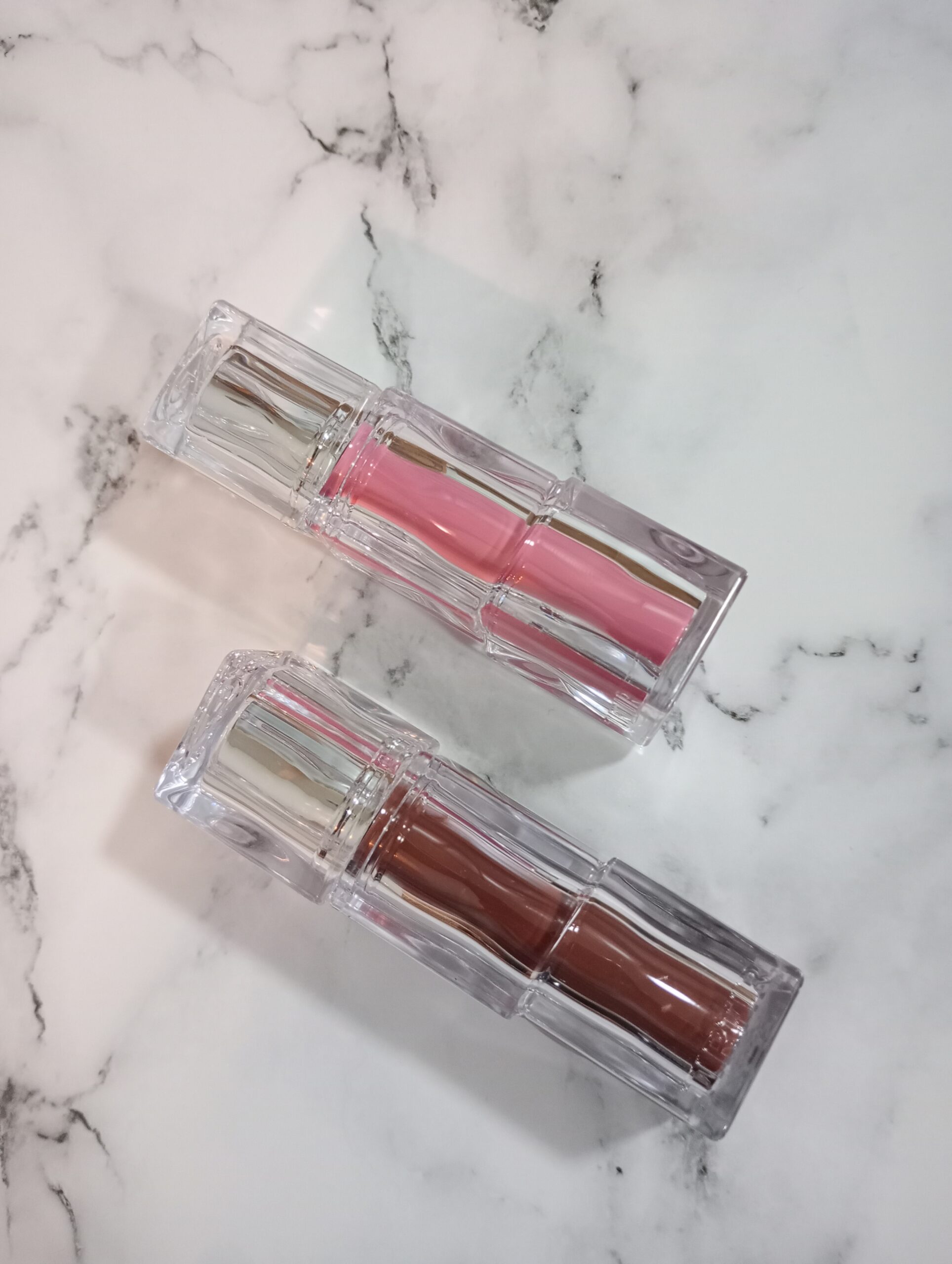 TIRTIRウォータリズムグロウティント06と13のスウォッチ。06は深みブラウン、13は赤みピンク系の発色。
